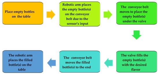 The proposed system has been implemented in accordance with IR 4.0 standards for rendering human intervention to a minimum level. The process flow diagram of the proposed system during the first stage of phase II is shown in Figure 4. The empty bottles during this stage are placed on the table and are placed on the conveyor belt by the robotic arm. At the later stages of the second automation phase, a bottle-feeding system with a pneumatic piston to push the empty bottles upward will be added to the existing system.