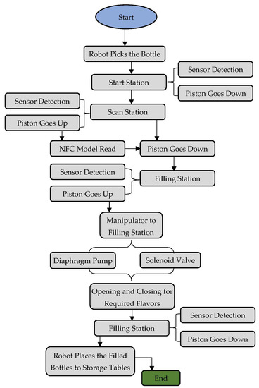 The operation of the proposed system requires no human intervention due to the implementation of full automation and control strategy in accordance with IR 4.0 principles. The system works on the idea of customized production as it can fulfill the individual customers’ demands. The customers can freely make their own choices regarding the quantity of plain yogurts and available flavors. The details of customers’ orders are pasted on the front sides of empty bottles. In the beginning, the robotic arm transfers the empty bottle from a bottle-feeding system on the left side to place it on the plate (the start station). As the sensor detects the bottle, a signal is sent to the controller to move the plate. In the next station, the Near Field Communication (NFC) module reads the tag that exists on the front side of the bottle to get the information of the customer order (amount and flavor). Next, the data from the NFC module is sent to the controller allowing the plate to move to the filling station. When the filling station’s sensor detects the bottle, the plate stops. The manipulator in this station adjusts itself to the filling position and fills the empty bottles depending upon the information received from the NFC module, according to the customer’s demands. After the filling process is done, the plate moves to the end of the production line, enabling a rest sensor and stopping at the end station, where the robotic arm picks the final product and puts it in a temporary storage area on the right side. The process flow chart of the yogurt filling process is shown in Figure 5. The filling process is initiated by pressing the “Start” button. The robot picks the empty bottles and places them on the conveyor belt. When a bottle is detected at “Start Station”, the pneumatic piston goes down, and the bottle moves to “Scan Station”. At the “Scan Station”, if the bottle is detected as empty, the pneumatic piston goes down, and the empty bottle moves to the filling station. The plain yogurt is filled in the empty bottle by opening the solenoid valve. The pneumatic piston goes down, and the bottle moves to the next step, where the customer’s defined flavor is filled in the bottle by opening the solenoid valve. After the filling process is finished, the relevant pneumatic piston goes down, and the filled bottle is conveyed to the endpoint. The proximity sensor fitted at the end of the conveyor originates the next event, which is transferring the filled yogurt bottles to the relevant location in the cold storage by a robotic arm. The Node-RED interface has been integrated with communication and control equipment to show the status of sensors installed in the system and facilitate the customers in making their own choices in terms of quantity and flavors of yogurts.