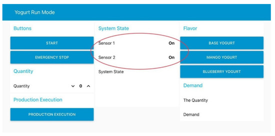 While if the starting of the system is done through the dashboard start button, the same process will happen with slight changes. First, the “Set Dashboard Mode” node will be triggered to enable the dashboard mode; then, the “Read All Sensors State” node will be triggered as previously mentioned. Afterward, the dashboard texts will appear informing the sensors’ states, as shown in Figure 7. The dashboard interface displays useful information like start and emergency stop buttons, quantity selection, and production execution, system state, flavor selection, and demand for specific flavors. Two flavors, namely mango and blueberry, are available for selection apart from plain yogurt. Once the quantity and demand are selected as per customers’ requirements, the production execution button is pressed to initiate the yogurt filling process. If any dangerous situation arises either due to unexpected events or equipment malfunctioning, the emergency stop button can be pressed to halt the production execution process. This step is necessary to ensure the safety of humans and machines involved in the production process.