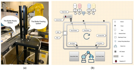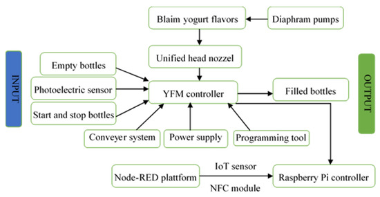 The fully automated operation of the flavored yogurt filling production line has been achieved by successfully implementing smart technologies. A bottle-feeding system was designed, fabricated, and implanted with the existing semi-automated system during the project’s second phase, as shown in Figure 10a. Moreover, an industrial robotic arm, manufactured by FANUC, was installed to achieve fully automated operation. During the first phase of automation, the empty bottles were to be manually placed on the production line. Similarly, after completing the filling process, the filled bottles were to be manually picked and stored in the storage area. However, due to the integration of the FANUC robotic arm and bottle-feeding system, all the process has become fully automated with no human intervention. The robotic arm now picks the empty bottles from the bottle-feeding system and places them on the assigned place over the production line. When the filling process is complete, the robotic arm picks the filled bottle and stores them in the storage area. Hence the whole process is now fully automated, causing increased productivity with fewer human resources requirements. In addition, the system is now running through Node-RED, providing an IoT tool, and it is a flexible platform that can connect multiple devices allowing machine-to-machine (M2M) communication. The complete design layout of the fully automated system is shown in Figure 10b. However, Figure 11 shows the block diagram of interconnected components of the hardware and software.