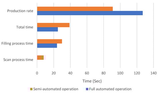 The first and foremost goal of automating the industrial production line was to increase the production rate of the system. A comparative performance analysis was conducted to evaluate the performance of the yogurt filling system by operating it in the fully automated and semi-automated modes of operation. The amount of time taken for the scanning and filing processes was noted and compared. Based on these times, the total time of operation and production rates were calculated. The results are shown in Figure 13. The time required for scanning and filling processes for the fully automated system is less than required for the semi-automated system. Zero time is required for the scanning process in case of fully automated operation. Consequently, the total time required for scanning and filling operations is comparatively lower for the fully automated operation, which is highly commendable. The production rate, measured in terms of bottles/h, is higher in the case of the fully automated system. The higher production rate justifies the implementation of the fully automated mode of operation.