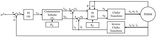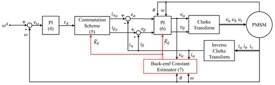 The block diagram of the proposed method, including the cascade PI controller with back-EMF compensation and the back-EMF constant estimator, is shown in Figure 4.