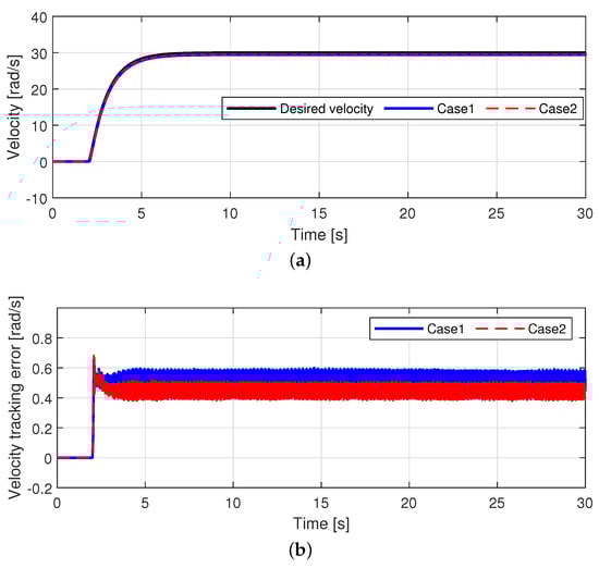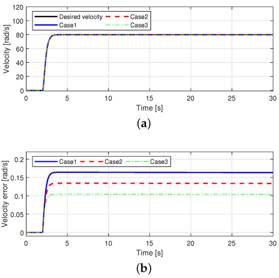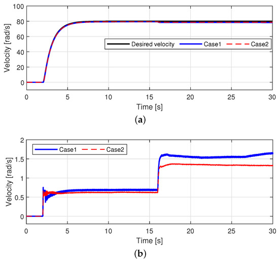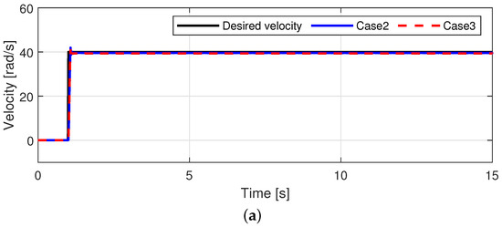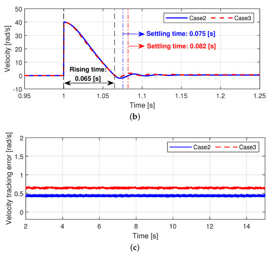 The velocity tracking performances are shown in Figure 15. Both methods have similar rising time (=0.065 s), whereas settling time of case 2 is faster than that of case 3. We can observe that the velocity tracking error of case 2 is smaller even though the same control gains were used in steady-state response. The velocity tracking errors were not zero, because an objective is not to optimize control performance in this paper.