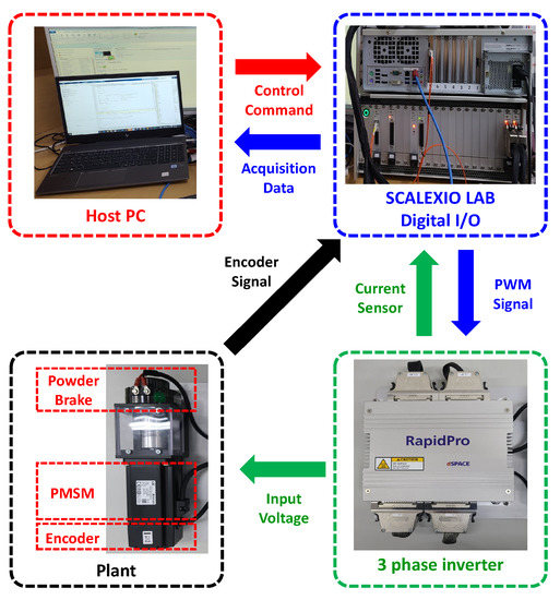 Experiments were tested to validate the performance of the proposed method. Figure 5 shows the hardware configuration of the PMSM driver set. Experiments were performed using ControlDesk software, two RapidPro, and a SCALEXIO real-time system. We generated a real-time control code in MATLAB/Simulink to apply ControlDesk. SCALEXIO supported a sample rate of 40 kHz. Each RapidPro unit consisted of three half-bridge power stage modules. The two switches of each half-bridge were driven by complementary signals with dead time to prevent feed-through faults. Surface mounted PMSM (APM-SB03ADK-9, Kwapil & Co, Wien, Austria) was directly connected to an encoder (2500 pulses per revolution). The parameters used in the experiments and simulations were determined by referring to the data sheet. Powder brake was used to generate load torque. A personal computer was used to implement the control program in C language, compile the program, and upload executable output code to the SCALEXIO real-time system. The switching frequency was set to be 20 kHz. To evaluate the performance of the proposed estimator, we assume there is a control situation in which the nominal value of the back-EMF constant is not accurately known. Two cases were tested as follows: