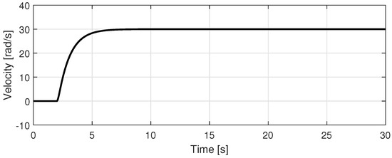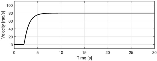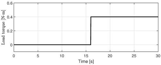 We conducted another experiment with 80 rad/s operation to evaluate the performance based on the presence of a load torque. Figure 10 shows the desired velocity for the 80 rad/s operation. A step load torque (=0.45 Nm) was injected after 16 s, as shown in Figure 11. Because the rated torque of the PMSM is 1.9 Nm, the injected load torque is approximately 23% of the rated torque.