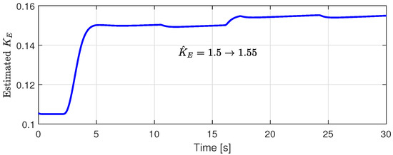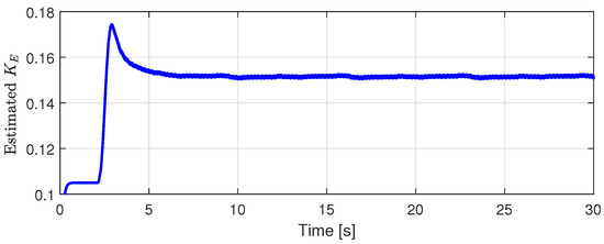 Figure 12 shows the back-EMF constant estimation performance for Case 3. When the load torque was injected at 16 s, the estimated back-EMF constant was changed from 0.15 to 0.155. As mentioned in the introduction, the estimated back-EMF constant depends on the variation in the flux linkage. We can also observe fluctuations with a low frequency of the estimated back-EMF constant caused by structural vibration, such as the alignment of the mechanical coupler between the PMSM and the powder brake.