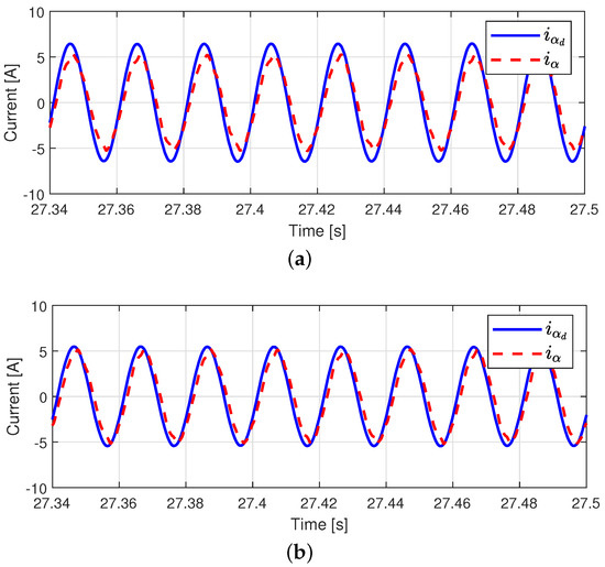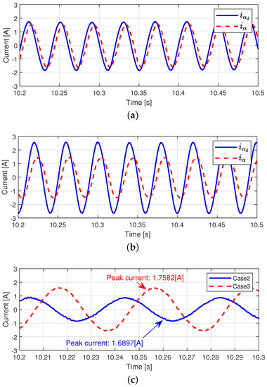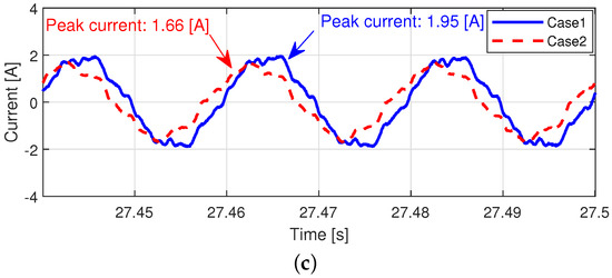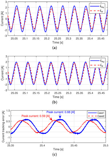 Figure 9 shows the current tracking performance and current tracking errors for both cases. In Figure 9a,b, even the phase delays of both methods are almost same, and the tracking performance of Case 2 is more close to the desired phase current compared to the phase current of Case 1. Therefore, in Case 2, the peak of the current tracking error decreased by approximately 10% from 1.37 A to 1.23 A.