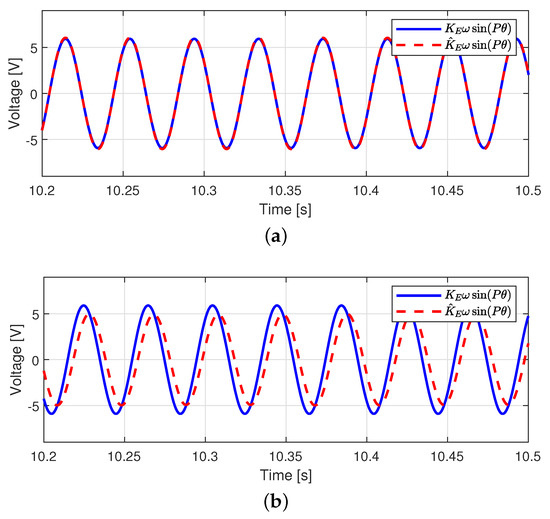 Figure 16 shows the back-emf estimation performance. In the existing technique [23], since a nominal back-EMF signal, , was estimated, was estimated in both methods. The phase of the nominal back-EMF signal and the estimated back-EMF signal in case 2 are almost in-phase, whereas the phase delay was observed in case 3. This back-EMF estimation performance can affect the velocity tracking performance because the control input was designed by using the estimated back-EMF constant.