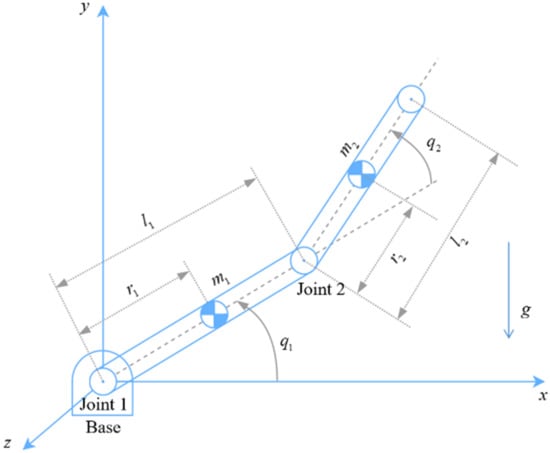 where are the vectors that represent robot joint angular positions, velocities, and accelerations, respectively; is the matrix of inertia, which is symmetric, bounded, and positive definite; is the matrix of the Coriolis and centripetal forces; is the vector of the control input torques; and , , and are the vector of the gravitational forces, friction, and disturbance, respectively.
