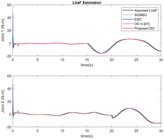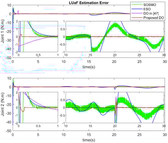 For the first part, the result of the comparison is presented in Figure 3 and Figure 4. Figure 3 shows the estimation results of LUaF estimation among four observers. Figure 4 shows the estimation error at each joint. As shown in the result, the ESO (the blue solid line) provides fast estimation result, however, the overshoot phenomenon at the convergence stage is the main disadvantage of the ESO. By contrast, the SOSMO (the green solid line) provides estimation result without the overshoot phenomenon as in ESO, however, the convergence time is a little slower. In addition, a low-pass filter is needed to reconstruct the estimated LUaF. In terms of estimation accuracy, both the ESO and SOSMO provide quite good estimation result in normal operation condition; however, when faults occur, the estimation errors become larger. The proposed DO (the red solid line) provides the LUaF estimation with a faster convergence speed compared to the SOSMO due to the linear characteristic of the observer elements. Compared to the ESO, the proposed DO eliminates the overshoot phenomenon. In addition, it achieves the highest estimation accuracy among three observers in both before and after faults occur. Moreover, the LUaF can be reconstructed directly without the need of a low-pass filter. Compared to the DO in [], the proposed DO obtains almost the same estimation accuracy, however, the estimation speed is faster.