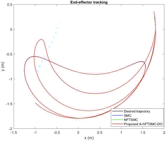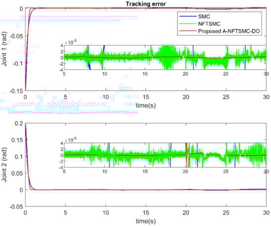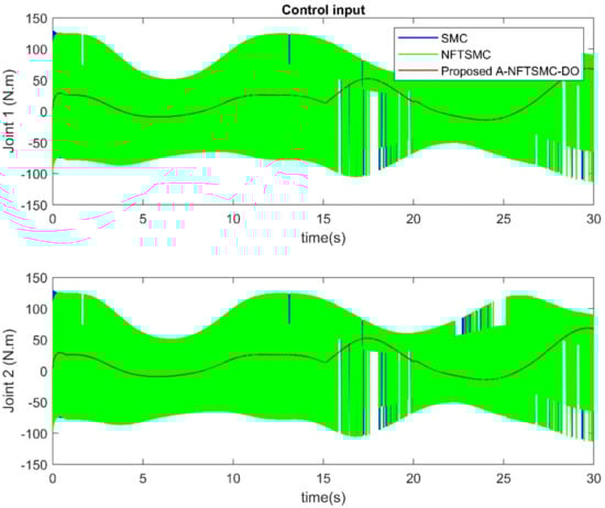 In the second part, in order to show the effectiveness of the proposed A-NFTSMC-DO method, its control performance will be compared with the two controllers: the conventional SMC and the NFTSMC. The results are shown in Figure 5, Figure 6 and Figure 7. Figure 5 and Figure 6 show the robot end-effector tracking and the joint tracking error among three controllers. As in the results, the SMC provides acceptable tracking performance. However, compared to others, its tracking error (the blue solid line) has the lowest accuracy. In addition, in terms of convergence speed, the conventional SMC takes a longer time for convergence. On the other hand, the NFTSMC (the green solid line) offers both higher tracking accuracy and faster convergence compared to the SMC. The proposed FTC method (the red solid line) offers the tracking error with the same convergence speed as the NFTSMC, meanwhile, it provides the highest tracking accuracy compared to others. Figure 7 shows the comparison of control input torque. As a result of the LUaF compensation, the switching gain parameter of the control law is now extremely small. Therefore, as we can see, the suggested A-NFTSMC-DO delivers reduced chattering control input torque. Furthermore, because of better characteristics of the adaptive law, the suggested controller can automatically adjust with the LUaF. The estimated value of the sliding gain is shown in Figure 8.