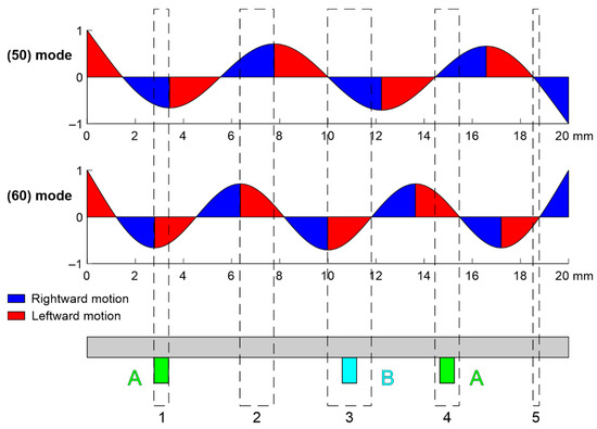 Schematics showing the location of the legs for standing wave (SW)-based locomotion with the (50) and (60) modes. Each colored half lobe represents the region where a leg produces a rightward or leftward movement of the robot. For bidirectional motion, legs should be located on the dashed vertical rectangles. Positions 1 and 4 were chosen for plate A and position 3 for plate B.