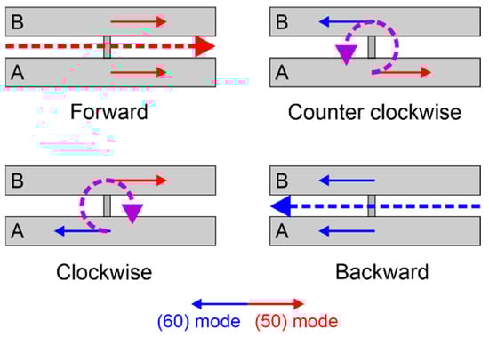 Graphical description of the four different types of motion of the robot. Each plate could be actuated either on the (50) or (60) mode for a bidirectional thrust.