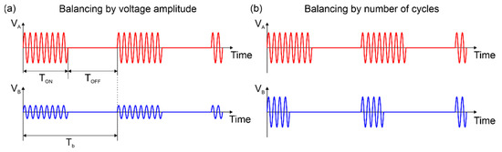 Excitation voltage signals applied to the plate resonators A (red color) and B (blue color). Each burst signal is characterized by the voltage amplitude, the burst period (), and the active period (). Two alternative actuations were considered: (a) both plates with the same number of sinusoidal cycles per burst but different voltages, or (b) both plates with the same voltage amplitude but different number of cycles.