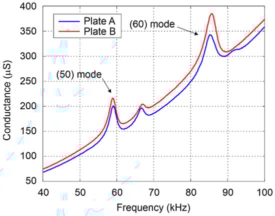 Table 2. The resonant frequency of the (50) and (60) modes were 59 and 86 kHz, respectively, while similar Q-factors around 26 and motional conductance in between 65 and 117 µS were estimated. Similar results were obtained for all the fabricated samples with the same nominal dimensions of the plates. Differences in the resonant frequencies below 2% were obtained among the fabricated samples, demonstrating the reproducibility of the process.