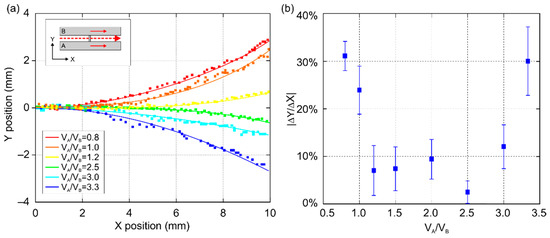 Figure 7b depicts the off-axis absolute deviation (Y-displacement to X-displacement ratio) of these trajectories. The ratio of voltages with the lowest deviation from the