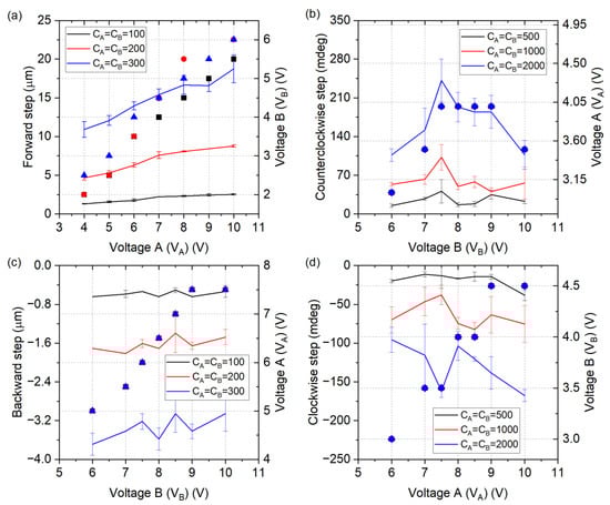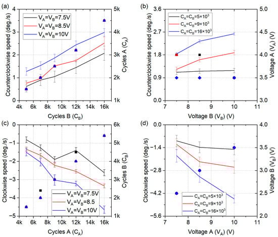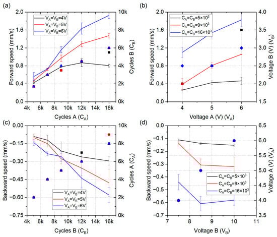 Figure 8a,b, with markers representing the combinations for a balanced motion by voltage amplitude or excitation cycles, respectively. As can be seen, both procedures allowed reaching a maximum speed of about 1.85 mm/s by (i) applying 6 V and 16,000 cycles on plate A and 6V and 6000 cycles to plate B or (ii) applying 6 V and 16,000 cycles to plate A and 3 V and 16,000 cycles to plate B. Similar results were obtained for other input combinations. Therefore, for a balanced forward motion, plate A required twice as much power than plate B, either by applying a 2:1 voltage ratio at equal number of cycles or a 8:3 number of cycles ratio at equal applied voltage.