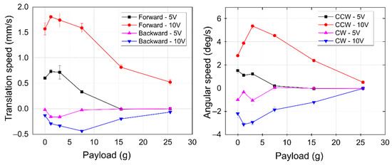Figure 8a,b shows the mean speed of the robot for forward motion, where both plates were excited at the (50) mode resonant frequency. The results from the balancing procedure are also depicted in