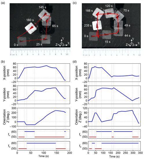 Results from the complex trajectory experiments, describing a 50 mm side right triangle (figures on the left) and a 40 mm side square (figures on the right). Top figures (a,c) show the robot position and orientation at some time instants of the preprogramed trajectory (red line). Bottom figures (b,d) detail the X- and Y-position and orientation of each trajectory vs. time and the sequence of resonant frequencies on plate A (fA) and plate B (fB) for actuation at the (50) or (60) modes.