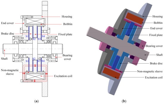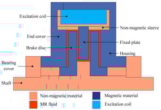 The MR brake is a representative MR actuator. It can effectively shorten the braking distance, reduce the braking lag time, and conveniently realize the integration of various new control technologies compared to traditional hydraulic brakes [18]. The disc-type MR brake is mainly composed of brake discs and the housing, and the rheological characteristics of the MR fluid are used to achieve braking performance.