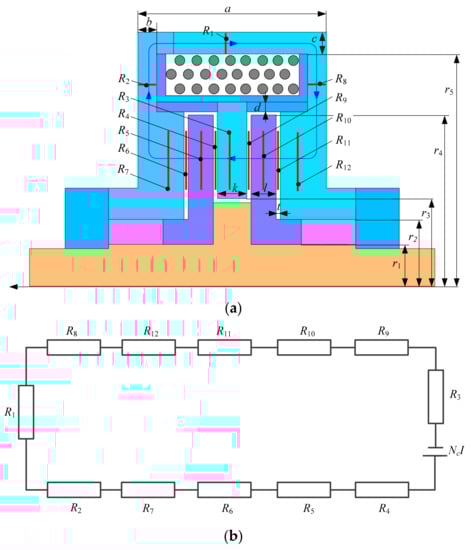 Diagram of magnetic circuit. (a) Control sections and (b) equivalent circuit.