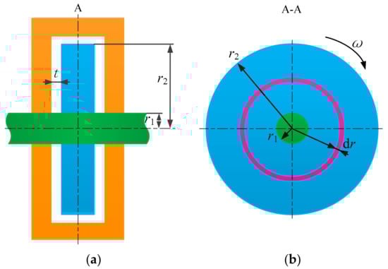 When the magnetic field acts on the MR brake, the output braking torque mainly includes the magnetic torque generated by the yield shear stress τ(B) and the viscous torque produced by the viscosity of the MR fluid. The braking torque of the radial damping gap at the single acting surface of the brake disc is calculated by using the infinitesimal method. Figure 3 shows the axial schematic diagram of the single brake disc.
