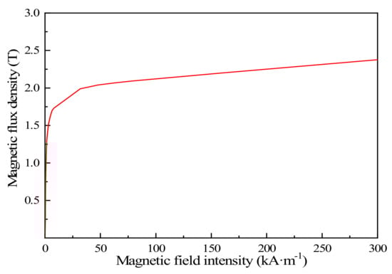 Figure 4 shows the magnetization characteristic curve of No. 10 steel. From the B–H curve, it can be seen that its hysteresis performance is better when the magnetic field intensity changes within 0–50 kA·m−1. Moreover, the manufacturing cost of No. 10 steel is relatively low, and the processing performance is good, so it is chosen as the magnetic material.