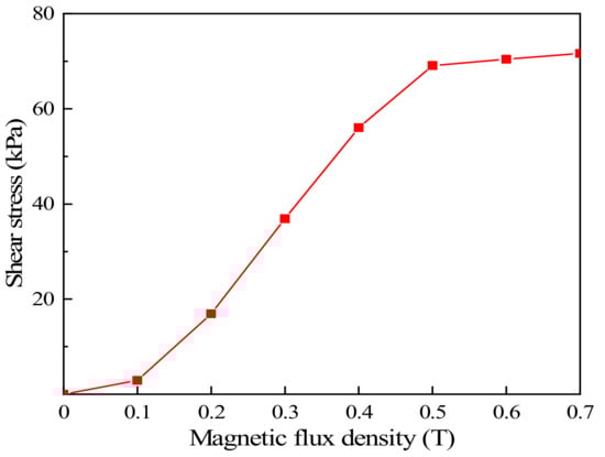 Figure 9 shows the change of the average magnetic flux density with the varied applied current. It can be seen that the average magnetic flux density increases significantly when the current varies within 0–1.2 A. After the applied current exceeds 1.2 A, the magnetic field intensity in the MR brake tends to saturation, and its growth rate is relatively slow.