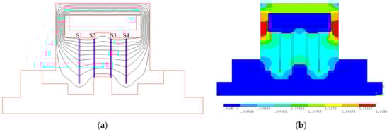 Magnetic circuit simulation results. (a) Distribution of magnetic flux lines and (b) distribution of magnetic flux density.