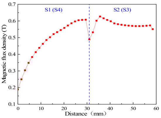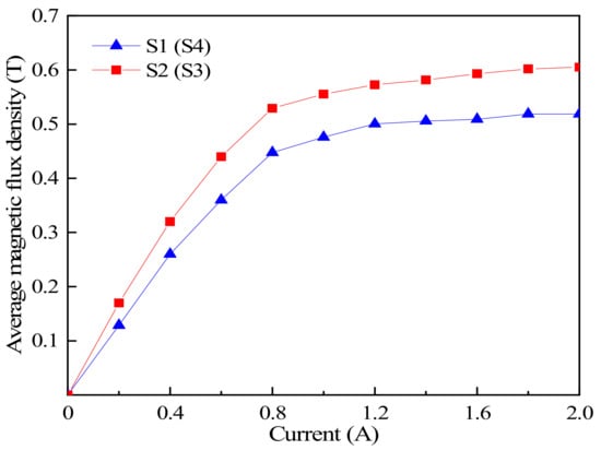 Figure 8 shows the magnetic flux density varying with the path of the flow channel at the applied current of 1.0 A. Since the internal effective structure of the MR brake is symmetrical about the central axis, the magnetic flux density at effective damping gap S1 and S4, as well as S2 and S3, is close to the same. The magnetic flux density at the beginning of the damping gap S1 and S4 is relatively small, mainly due to the material factors of the brake disc, which causes partial magnetic flux leakage. As the path increases, the effective damping gap is closer to the excitation coil, the distribution of the magnetic flux lines is relatively dense, and magnetic flux density gradually increases. At the end close to the axial flow channel, the magnetic flux density decreases slightly. The magnetic flux density at the damping gap S2 and S3 also varies at the beginning and the end, but the magnetic flux lines at most positions are more evenly distributed. It can be seen from Figure 8 that most of the magnetic flux density is in a relatively good range, and the magnetic flux lines are used reasonably. When the applied current is 1.0 A, the average magnetic flux density of damping gap S1 and S4 is about 0.48 T, and the average magnetic flux density of S2 and S3 is about 0.56 T.