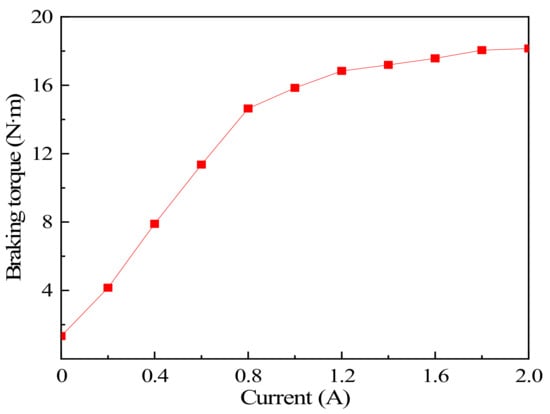 Figure 10 shows the braking torque varying with the applied current at the rotation speed of 400 r·min−1, and the overall trend of braking torque increases with the applied current. When the current increases within 0–1.2 A, it can be seen that the average magnetic flux density at the effective damping gap increases significantly, so the braking torque also increases rapidly. When the current changes from 1.2 A to 2.0 A, the braking torque increases more slowly, and the increase amplitude is not large. When the current approaches 2 A, the braking performance hardly improves, mainly due to the average magnetic flux density not increasing significantly with the current in this interval. In addition, the shear stress almost reaches saturation under this magnetic flux density, so that the braking performance hardly improves with the increase in current. It can be concluded that the maximum braking torque is about 18.15 N·m.