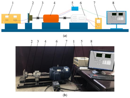 Experimental test rig. (a) Schematic diagram and (b) test rig. (1) Power supply, (2) MR brake, (3) coupling, (4) speed torque sensor, (5) acquisition board, (6) three-phase asynchronous AC motor, (7) frequency converter, (8) computer.