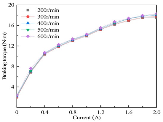 In the experiment, the current adjustment range is 0–2 A, and the range of the rotation speed is 200–600 r·min−1. Figure 13 shows the braking torque varying with the applied current. It can be seen that with the increase in the applied current, the braking torque increases in almost the same trend. When the current changes within 0–1.6 A, the increasing rate is relatively large, and the change trend is obvious. However, when the current increases within 1.6–2.0 A, the output torque tends to be flat since the internal magnetic field of the brake is almost saturated, which is less affected by the applied current. The experimental results illustrate that the maximum braking torque can reach 18.29 N·m when the applied current is 2.0 A and the rotational speed is 600 r·min−1.