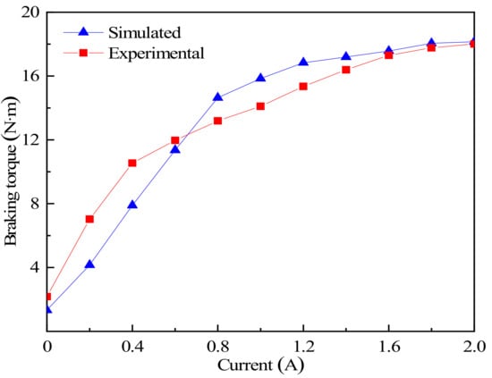 Figure 14 shows the comparison between the simulated results and the experimental results of the MR brake at the speed of 400 n·min−1. The simulated braking torque in the zero-field state is 1.33 N·m, and the experimental value is 2.18 N·m at the applied current of 0 A. It is mainly due to the friction between the rotating parts of the brake that the experimental torque value is greater than the theoretical value. When the current continues to increase within a certain range, the experimental braking torque is still greater than the simulated one, but the increasing trend decreases. It can be seen that the simulated braking torque is greater than the experimental value when the current reaches about 0.65 A. The main reason is that the magnetic flux leakage phenomenon and coil heating are ignored, and the Bingham model expression does not take into account the shear thinning phenomenon at the simulation process, which leads to the measured torque value being slightly smaller than the simulated value. When the applied current is 2.0 A, the experimental value is almost close to the simulated value, which is about 18.15 N·m. The experimental curve is consistent with the overall trend of the simulation curve, indicating that the established braking torque model and magnetic field simulation can better express the actual braking performance. It is reflected from the side that the magnetic field simulation of the brake plays an important reference role in the overall experimental design.