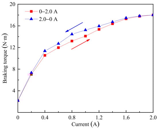 Two modes of loading and unloading are adopted for the applied current of the MR brake. First, the current is gradually loaded from 0 A to 2.0 A with an interval of 0.2 A, and then the current is gradually reduced from 2.0 A to 0 A by the unloading input mode. Figure 16 shows the hysteresis curve of the braking torque with the current when the speed is 400 r·min−1. It can be seen that under the same rotational speed and the same applied current state, the braking torque in the unloaded state is slightly larger than the torque in the loaded state. The hysteresis phenomenon of the torque curve under the two input states is mainly due to the hysteresis characteristic of the magnetic material when the magnetic flux density changes [35,36]. The larger the distance between the torque curves in the two states, the more hysteresis loss of the magnetic material. In the two opposite loading modes, the torque difference of the MR brake under the same current is small, so the hysteresis characteristic is ideal.