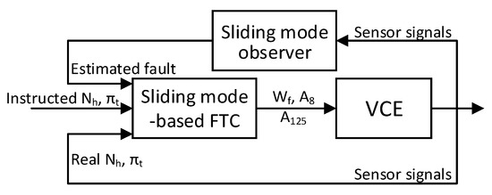 Within the aviation community, all developments focus on ensuring and improving the required safety levels and reducing the risks that critical failures occur [1]. This is especially true for safety-critical systems like aircraft engines. As the “brain” of an aircraft engine, the control system takes on the tasks of control, monitoring and health management of the engine. However, major parts of the control system including sensors, actuators and the engine itself, shown in Figure 1, operate in harsh conditions, which accelerates the occurrences of faults. These faults may lead to catastrophic events with significant costs, both in terms of economy and human lives. Though in most situations the occurrences of faults in the systems cannot be prevented, some actions can still be taken to prevent the disasters or, at least to minimize the severity. A way to meet this requirement is by means of a fault tolerant control (FTC) design, which aims to maintain the overall system stability and acceptable performance in the event of faults/failures [1,2]. So far, most FTC designs for aircraft engines focus on the diagnosis and reconfiguration methods of sensor faults. Rausch et al. [3] present a model-based fault detection scheme using sensor residuals from an extended Kalman filter and an online fault accommodation approach via suitable control adjustments which are obtained through off-line optimization for recovery of stall margins and thrust. Nyulászi et al. [4] present the design of the diagnostic and backup system of sensors which uses a voting method and the analytical redundancy provided by polynomial models and neural networks. Huang [5] uses an auto-associative neural network (AANN) to construct the analytical redundancy of sensors, ensuring the closed-loop control reliability of an aircraft engine. Other researches deal with the gas-path performance deterioration of aircraft engines. Litt et al. [6] use the relationship between the degradation level and the overshoot in engine temperature ratio to adapt the controller and compensate for a thrust response variation in an engine. Turso et al. [7] propose a Lyapunov Function-based robust control design to accommodate engine deterioration. It transforms the influence of deterioration into a scheduling parameter, thus constructing the plant uncertainty. Finally, the robust control problem is solved with Lyapunov theorems. Zaccaria et al. [8] propose an adaptive control scheme to compensate for the effects of engine degradation over the lifetime. The component degradation level is monitored by a diagnostic tool that estimates performance variations from the available measurements and then is used by an observer-based model predictive controller to maintain the safe operation of the engine.
