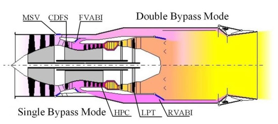 The research object here is a double-bypass variable cycle engine, shown in Figure 3 [30]. It operates in two different modes: the double bypass mode and the single bypass mode. The double bypass mode usually works during take-off, descent and subsonic cruise while the single bypass mode works during acceleration, climb-out, and supersonic cruise. VCE incorporates several actuators/variable geometries such as the mode selector valve (MSV), the front and rear variable area bypass injectors (FVABI and RVABI), the inlet guide vanes (IGV) of fan and core driven fan stage (CDFS), the exhaust nozzle throat area and exit area, etc. VCE uses these geometries to alter to different operation modes. For example, in the double bypass mode, the MSV fully opens, permitting a portion of the fan airstream to bypass the CDFS through the outer bypass-duct and the rest to go through the CDFS. The CDFS IGV is closed to reduce the core flow and increase the overall bypass ratio. The FVABI stays in an intermediate position to obtain the requisite static pressure balance between inner and outer bypass flows. The RVABI and exhaust nozzle area adjusts the bypass ratio and fan backpressure for best fuel consumption on subsonic cruises, and the exhaust velocity for noise suppression on takeoff.