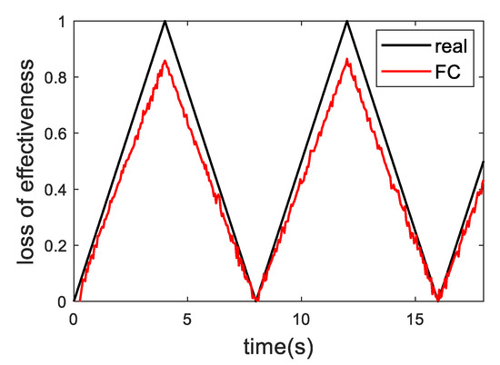 Let , and assume that changes within 0~1, the fault reconstruction (FC) result is displayed in Figure 4. As the red dashed line shows, the observer can roughly reproduce the effectiveness change. However, there is still an error due to the approximation of the equivalent output injection signal.