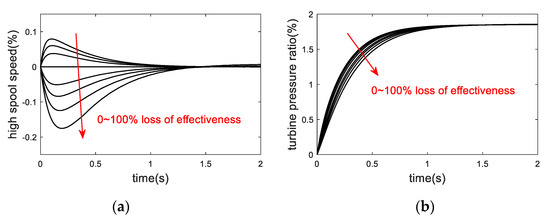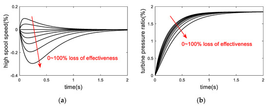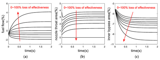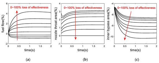 The fault estimation information can have an impact on the fault tolerant control result. Assume the real effectiveness matrix to be , Figure 10a shows the response of controlled variables in different fault reconstruction (FC) situations of . It can be seen that the accurate reconstruction situation produces the minimum variation of the high-pressure spool speed, shown in the black line. This can be explained by the switching function defined in (19). Given the fact that the nonlinear part of the SMC law () takes less part in this simulation compared to the linear part (), so when the reconstruction information is accurate, the derivative of the switching function can be approximated to be: