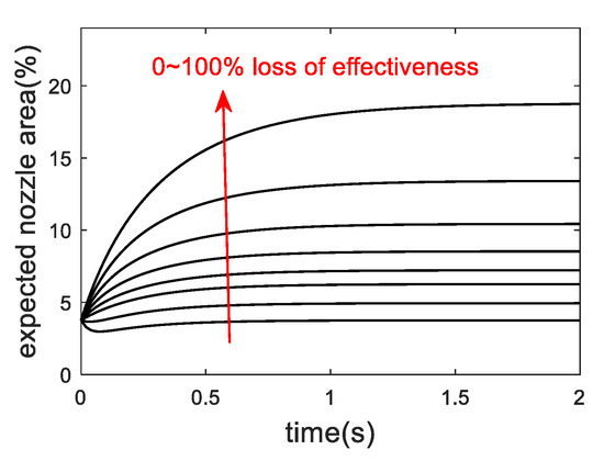 Next, we can verify the fault tolerant ability of the proposed design. Assume that the SMO estimates the effectiveness matrix to be , which means that the actuator still has part of the control effectiveness. Applying the following control instruction: hold constant and increase by 0.1 (a normalized value of 1.85%), the responses of the closed-loop control system under different effectiveness loss conditions ranging from 0~100% are shown in Figure 5 and Figure 6. It can be seen that the FTC design achieves the same control goal in all the faulty situations, even when the actuator totally fails to work. In this case, no longer participates in the control process and the control effect is redistributed to the remaining unfaulty actuators. From Figure 5, it is also seen that as the loss level of effectiveness increases, the controlled variables require more time to settle down. This is due to the discrepancy between the expected control signals and the real control signals. Figure 7 displays the expected that are calculated with the FTC law under all faulty conditions. When the actuator fails, it can no longer complete the expected control task that the controller gives, so the controller has to keep on making adjustments until the control goal is satisfied. The discrepancy becomes bigger as the actuator deteriorates. Usually, it will also lead to a larger variation of the remaining control variables. Similarly, the FTC results can be verified with adaptive SMC design, shown in Figure 8 and Figure 9, which will not be discussed any further here.