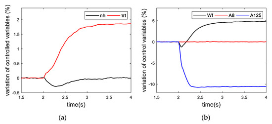 Here we verify the FTC of the proposed design and this is performed by comparing the control results between the fault-free and faulty situations. First, assume that the system is fault-free. At 2 s, the following control instruction is applied: hold constant and increase by 1.85%, we can see in Figure 13a that reaches the set value as expected and remain steady after 1.5 s. The control variables are depicted in Figure 13b where finally drops by 1.71%, increases by 3.65% and reduces by 5.46% in the steady state. Next, suppose that a lock-in-place fault happens to the actuator, which means , and the fault reconstruction method gives an inaccurate estimation, which is . As is seen in Figure 13a, the control goal is realized as well. In the steady state, increases by 4.78%, drops by 10.57% and does not change at all. Compared to the simulation result in Section 3, the curves in the HIL test look rougher. The main reason is that the controlled object here is the component level model of VCE, which possesses more nonlinear characteristics. Moreover, the HIL test involves many characteristics of the real control system, including the actuating property of actuators, the inertia of sensors, the noise of all the electronical components, the stability of the control time cycle, etc. Similar results can be attained with the adaptive method, shown in Figure 14.