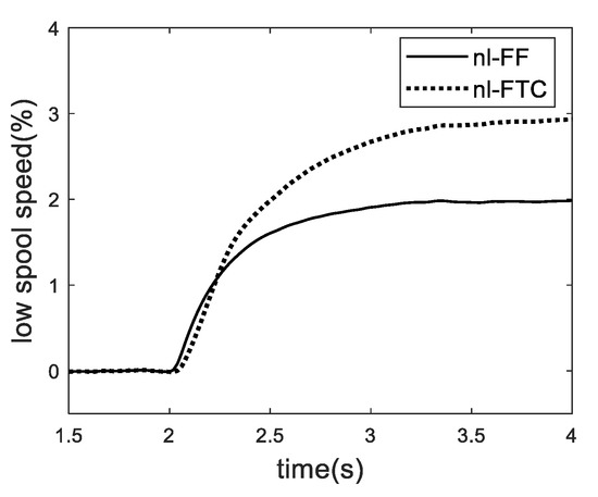 Note that although the FTC case reaches the same control goal as the fault-free case, it does not mean that the engine operating conditions in the two cases are totally the same. Figure 15 shows the difference of low-pressure spool speeds between the fault-free and lock-in-place fault condition, and this owes to the difference of the control variables in these two situations.