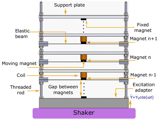 Figure 1 illustrates the generic proposed vibration energy harvester. It consists of N neodymium magnets guided by elastic steel beams and weakly coupled by repulsive magnetic forces. These moving magnets are placed between top and bottom fixed magnets. The coupling is tuned by varying the gap between magnets thanks to the changement of position of the beams inserted into threaded rods. Wire-wound copper coils are wrapped around the moving magnets. When the device is subjected to a harmonic base excitation where is the imposed acceleration amplitude, each moving magnet oscillates around its equilibrium position. Consequently, a current is induced in each coil according to Lorentz’ law. quantifies the displacement of the magnets. The two magnets at the ends of the array are considered to be fixed so that . The periodicity of the structure is broken by mistuning few magnet masses.
