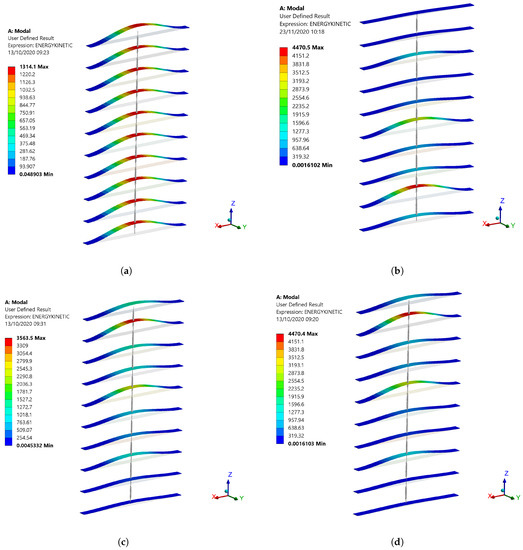The first mode shapes and their sensitivity to the introduced mistuning are shown in Figure 2. The vibrations of the periodic system, observed in Figure 2a, are uniformly distributed. Then, the mistuning was introduced to the 10-beams structure by varying the density of three arbitrary beams among 10 by (the 3rd, 6th and 9th beams and the 2nd, 5th and 8th beams counting from the bottom in Figure 2b,c, respectively). The perturbed beams have notably more displacements than the others and this is modeled in terms of kinetic energy confined in the mistuned regions shown in Figure 2b,c. Comparing the results of the configurations illustrated in Figure 2c,d where the irregularities are placed in the same positions but with different amount, the energy localization is more accentuated and kinetic energies of the perturbed beams are significantly higher then the others in the case of the density mistuning by .