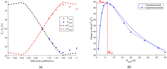 The harvested power with load resistances is numerically calculated for the optimal mistuning value based on Equation (9). While varying the load resistances during the experimental tests, the current flowing in each load resistance provides an electric power calculated as where V is the voltage generated by the coil. As shown in Figure 3b, the optimal load resistance which gives the maximum power is for both numerical and experimental results.