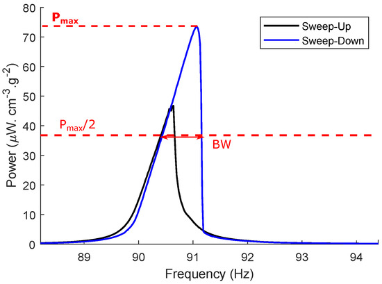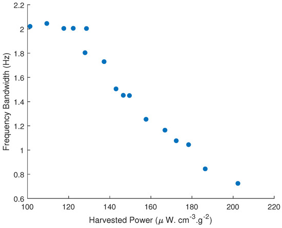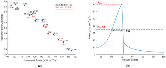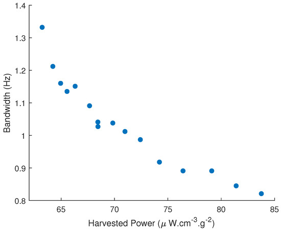Introducing these optimal values in the model, the frequency response in terms of harvested power is calculated and plotted in Figure 8b.