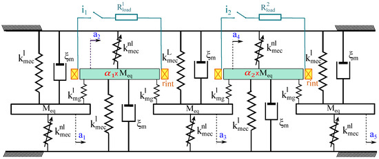 To do that, a continuous optimization procedure involving discrete variables is used [48]. The set of discrete variables contains and which stand for the mistuning coefficients of the two perturbed oscillators. For these two values, the multiple possible combinations are treated. A continuous optimization algorithm, implemented in MATLAB, is called according to each combination of discrete variables. During the continuous optimization, those discrete variables denote the position and the value of the mistuning simultaneously. For that, they are modeled as a first step as discrete and then as continuous. In the case of two successive perturbed magnets, the combination is eliminated and not treated. This choice is made in order to have distributed perturbations over the network so that the energy localization is more efficient. During the conducted simulations, this system of equations is solved by the ode45 MATLAB solver. The optimization returns the position of the mass mistuning and the maximum harvested energy of the best configuration. Results indicate that the 5-DOFs system with mistuning of the 2nd and 4th DOFs, illustrated by the equivalent model in Figure 6, give the maximum harvested energy. Thus, the harvested power will be calculated through this expression in the following study: , where and are the harvested powers from the DOFs 2 and 4, respectively.