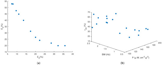 (a) Pareto front of the 5-DOFs system: E2 versus E4. (b) Pareto front of the 5-DOFs system: frequency bandwidth versus harvested power with the corresponding energy localization rates in %.