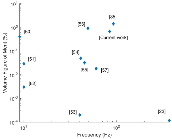 To compare the optimized proposed harvester performance with the current state-of-the-art, the volume figure of merit () proposed by [49] has been chosen among diverse performance metrics in the literature for being the most general criterion. The volume figure of merit is the ratio of the harvester useful power output transferred to the load to the maximum theoretical power flowing into an equivalent device. This equivalent device has a cubic geometry with the same volume as the original harvester one but with a proof mass having the density of gold occupying this volume half, while the other half is destined to oscillation [49]. Hence, this figure of merit is calculated according to the following expression: