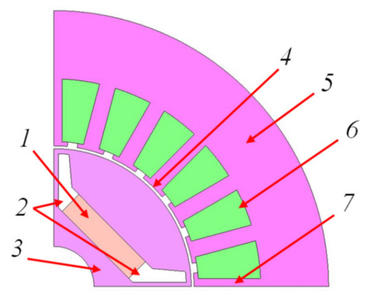 Initial interior permanent magnet synchronous motors (IPMSM) geometry in JMAG Designer that includes the permanent magnet (PM) (1), rotor slits (2), rotor core (3), air gap (4), stator back iron (5), stator slots (6), and stator teeth (7).